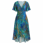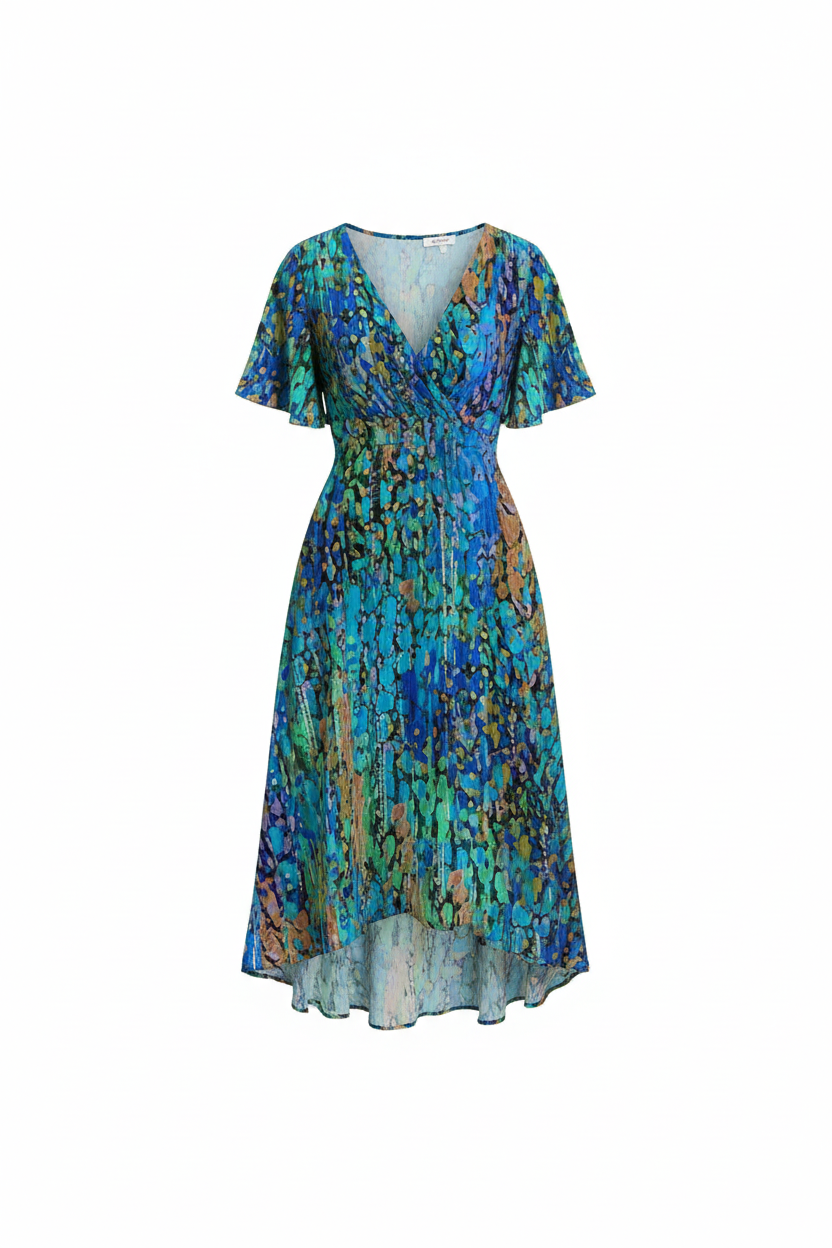 Cette robe a un décolleté croisé élégant qui met en valeur votre silhouette. La taille cintrée et l'ourlet asymétrique créent un effet élancé et aérien qui flatte tous les types de corps.