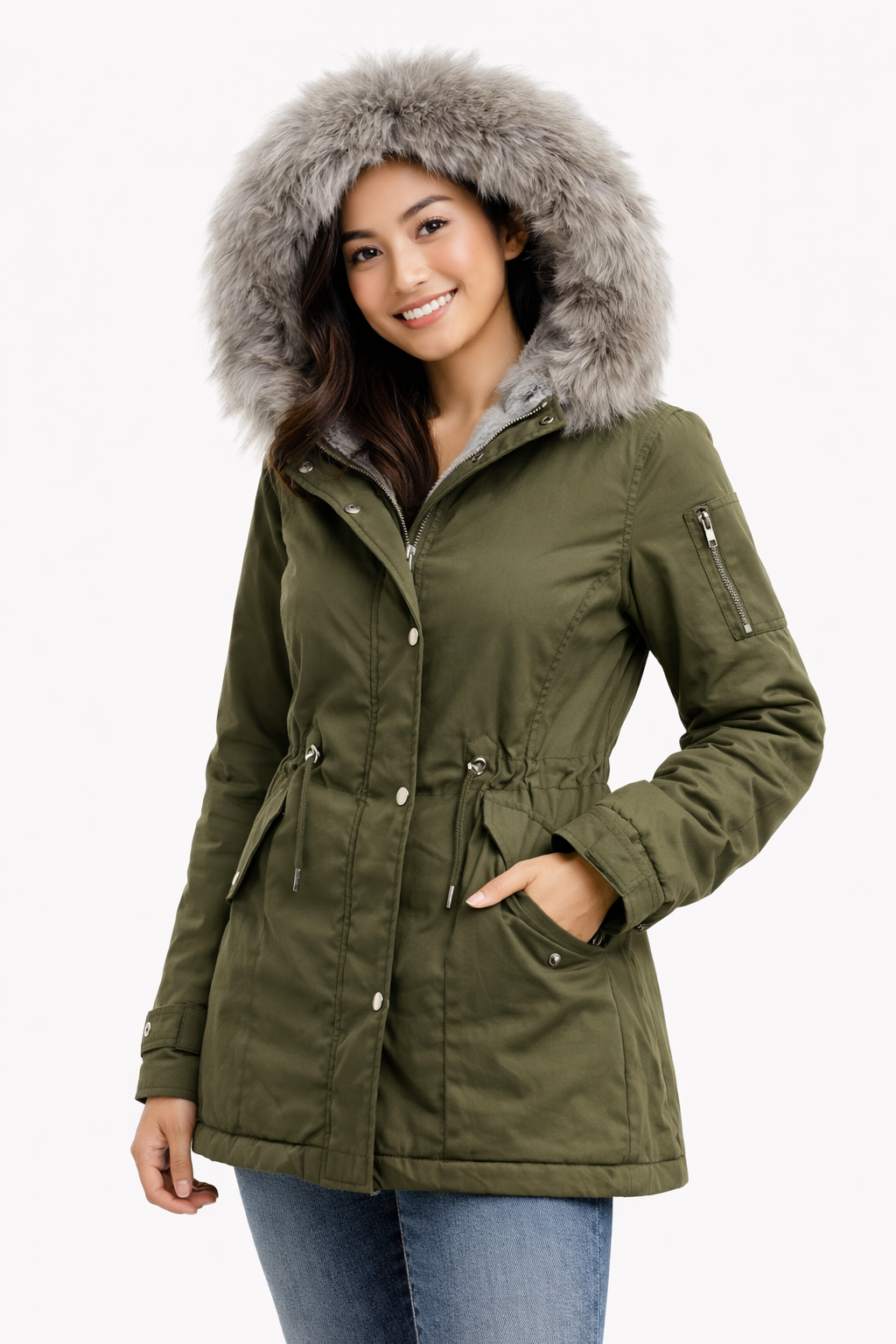 • Capuche : Bordée de fausse fourrure