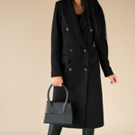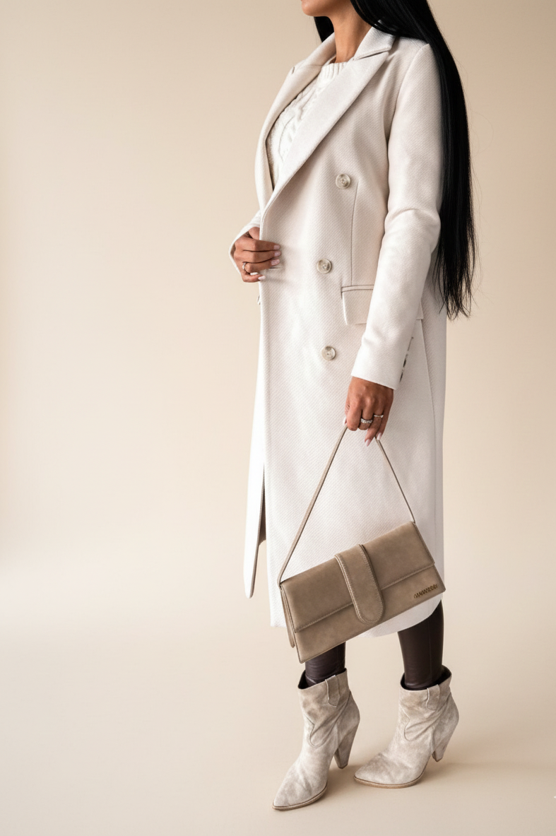 Sa coupe longue droite, arrivant légèrement au-dessus du genou, apporte une silhouette soignée et équilibrée. Le double boutonnage classique renforce son allure élégante, tandis que la coupe subtilement cintrée met en valeur la silhouette sans restreindre la liberté de mouvement, permettant de porter facilement un pull en dessous.