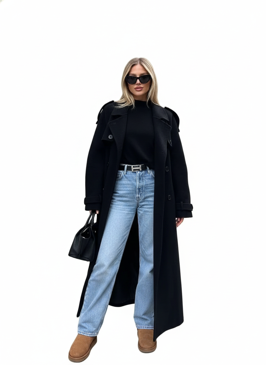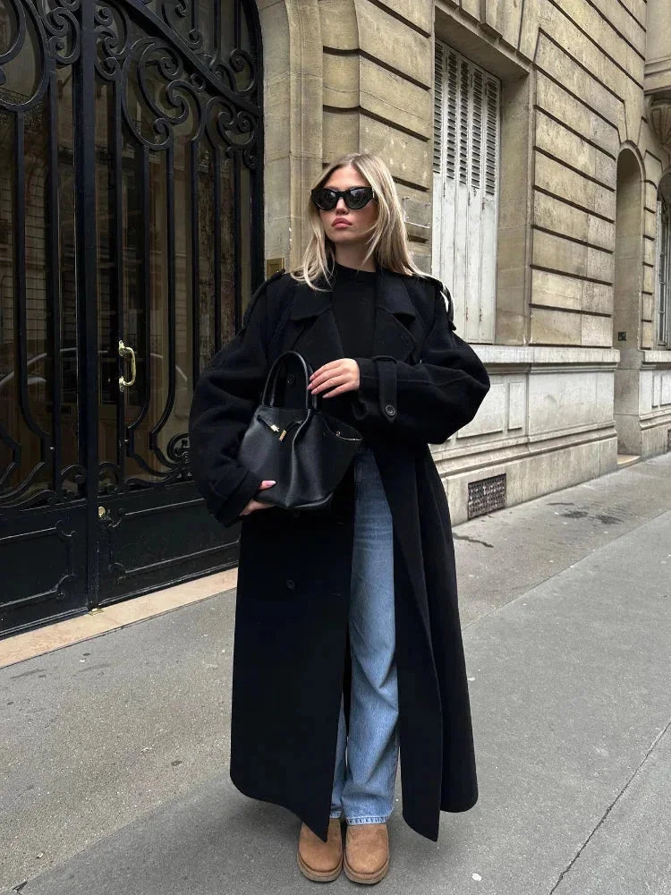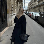 Milan Manteau Noir Femme – Revers Larges Élégants, Ceinture Ajustable & Style Urbain