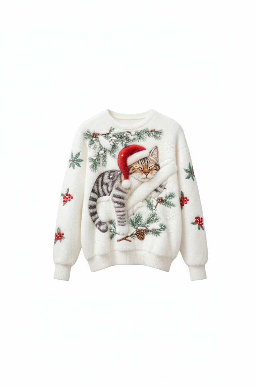 Ce pull festif et douillet allie chaleur, charme et caractère saisonnier, avec un chat magnifiquement détaillé se reposant dans une scène hivernale. La texture douce et moelleuse offre une sensation premium, le rendant parfait pour les journées d'hiver décontractées ou les rassemblements festifs.